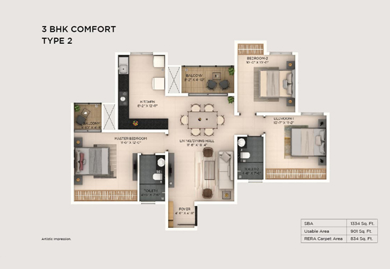 | 3 BHK Comfort | 1334 - 1088 Sqft | 1.2 Cr |