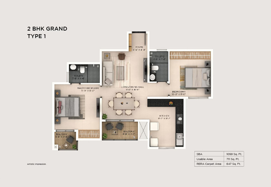 | 2 BHK Grand | 1059 - 1088 Sqft | 96.9 lakhs |